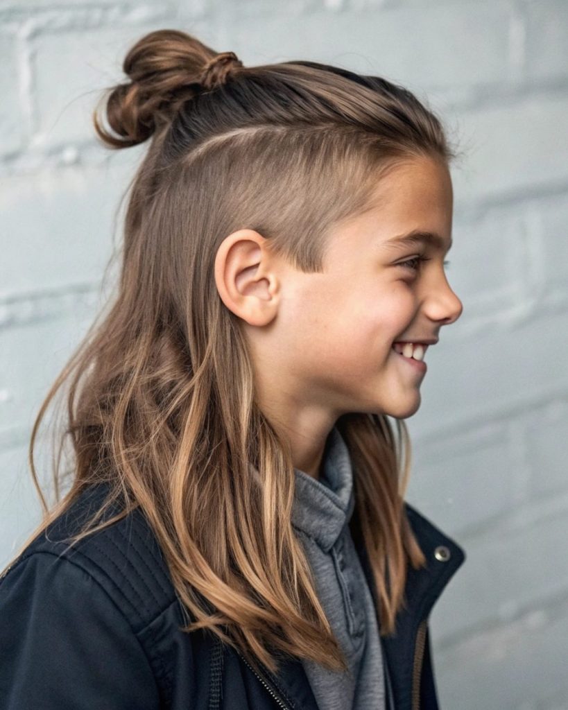 More and more boys are rocking longer hair these days, and I love it! If your son has shoulder-length or longer hair, the half-up style works just as well for him as it does for girls. Pull the top section back and secure it with a small elastic. It keeps hair out of his face while still showing off the length he’s been growing.